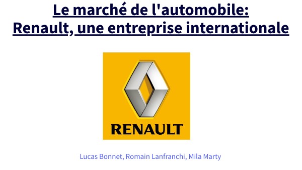 Le groupe Renault est un constructeur automobile français.Le groupe Renault possède des usines et filiales à travers le monde entier. Fondée par les frères Louis, Marcel et Fernand Renault en 1898, l'entreprise joue, lors de la Première Guerre mondiale, un rôle essentiel.
