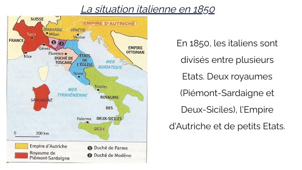 En 1850, les italiens sont divisés entre plusieurs Etats. Deux royaumes (Piémont-Sardaigne et Deux-Siciles), l'Empire d'Autriche et de petits Etats.