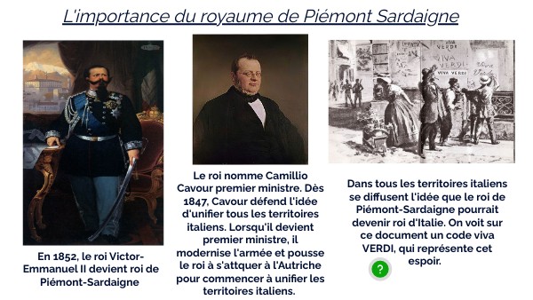 Le roi nomme Camillio Cavour premier ministre. Dès 1847, Cavour défend l'idée d'unifier tous les territoires italiens. Lorsqu'il devient premier ministre, il modernise l'armée et pousse le roi à s'attquer à l'Autriche pour commencer à unifier les territoires italiens.