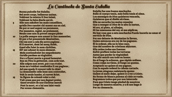 Eulalia fue una buena muchacha. Bello el cuerpo tenía, más bella tenía el alma. Los enemigos de Dios quisieron vencerla, Quisieron que al diablo sirviese. Ella no escucha los malos consejos Que a renegar al Dios de lo alto la instan, Ni oro, ni plata, ni alhajas, Ni las amenazas del rey, ni sus súplicas, No hay cosa que a esta muchacha Pueda hacerla no amar el servicio de Dios. Por eso delante de Maximino la llevan, Quien entonces era rey de los paganos. Él le ordenó, ella no le hizo caso, Que del nombre de cristiana abjurase. Ella reúne todas sus fuerzas: Sufrir prefiere todas las torturas Antes que perder la virginidad; Por ello murió con todo su honor. En el fuego la echaron, que rápido ardiese. Como culpa no tiene, el fuego no quema. Aceptarlo no quiere el rey pagano. Con la espada ordenó la cabeza cortarle. La joven ninguna resistencia opone: Quiere el suelo dejar, quiere ir a ver a Cristo. En forma de blanca paloma al cielo se vuela. Roguemos todos que por nos interceda Para que Cristo tenga piedad de nosotros Luego de nuestra muerte, y a él nos haga ir Por su clemencia.