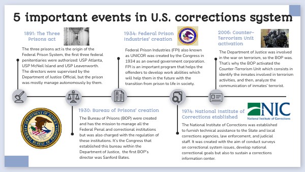 Cosmos. Criminology. Module 7: How does the corrections process impact the increase or decrease of crime? 7.01 A Brief History. May 3, 2022 "Federal Bureau of Prisons". BOP. May 8, 2022 <https://www.bop.gov/about/history/timeline.jsp> "Federal Bureau of Prisons". Wikispooks. May 8, 2022 <https://wikispooks.com/wiki/Federal_Bureau_of_Prisons> "History of the US prison system". Stacker. May 8, 2022 <https://stacker.com/stories/4894/history-us-prison-system> "National Institute of Corrections". National Institute of Corrections. May 8, 2022 <https://nicic.gov/>