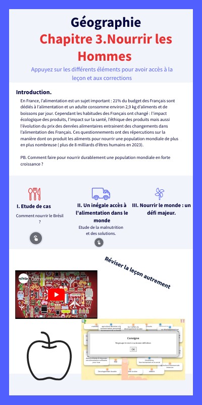 En France, l’alimentation est un sujet important : 21% du budget des Français sont dédiés à l’alimentation et un adulte consomme environ 2,9 kg d’aliments et de boissons par jour. Cependant les habitudes des Français ont changé : l’impact écologique des produits, l’impact sur la santé, l’éthique des produits mais aussi l’évolution du prix des denrées alimentaires entrainent des changements dans l’alimentation des Français. Ces questionnements ont des répercutions sur la manière dont on produit les aliments pour nourrir une population mondiale de plus en plus nombreuse ( plus de 8 milliards d’êtres humains en 2023). PB. Comment faire pour nourrir durablement une population mondiale en forte croissance ?