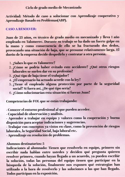 Ciclo de grado medio de Mecanizado Actividad: Método de caso a solucionar con Aprendizaje cooperativo y Aprendizaje Basado en Problemas(ABP). CASO A RESOLVER: Juan de 25 años, es técnico de grado medio en mecanizado y lleva 1 año empleado en Talomerec. Durante su trabajo se ha dado un fuerte golpe en la mano y como consecuencia de ello se ha fracturado dos dedos, provocando una situación de baja, que se presume relativamente larga. El dueño de la empresa decide despedirlo y contratar a otra persona.