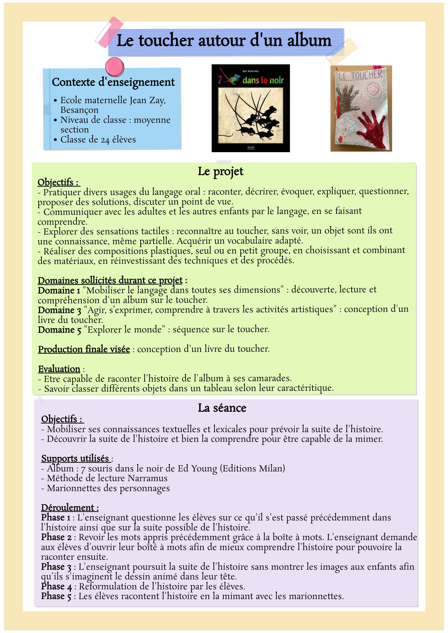 Domaine 1 "Mobiliser le langage dans toutes ses dimensions" : découverte, lecture et compréhension d'un album sur le toucher. Domaine 3 "Agir, s’exprimer, comprendre à travers les activités artistiques" : conception d'un livre du toucher. Domaine 5 "Explorer le monde" : séquence sur le toucher. Production finale visée : conception d'un livre du toucher. Evaluation : - Etre capable de raconter l'histoire de l'album à ses camarades. - Savoir classer différents objets dans un tableau selon leur caractéritique.