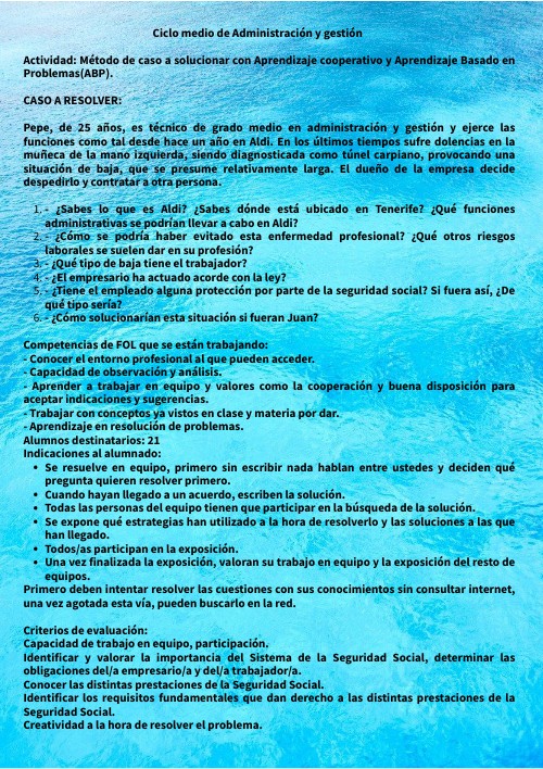 Ciclo medio de Administración y gestión Actividad: Método de caso a solucionar con Aprendizaje cooperativo y Aprendizaje Basado en Problemas(ABP). CASO A RESOLVER: Pepe, de 25 años, es técnico de grado medio en administración y gestión y ejerce las funciones como tal desde hace un año en Aldi. En los últimos tiempos sufre dolencias en la muñeca de la mano izquierda, siendo diagnosticada como túnel carpiano, provocando una situación de baja, que se presume relativamente larga. El dueño de la empresa decide despedirlo y contratar a otra persona.