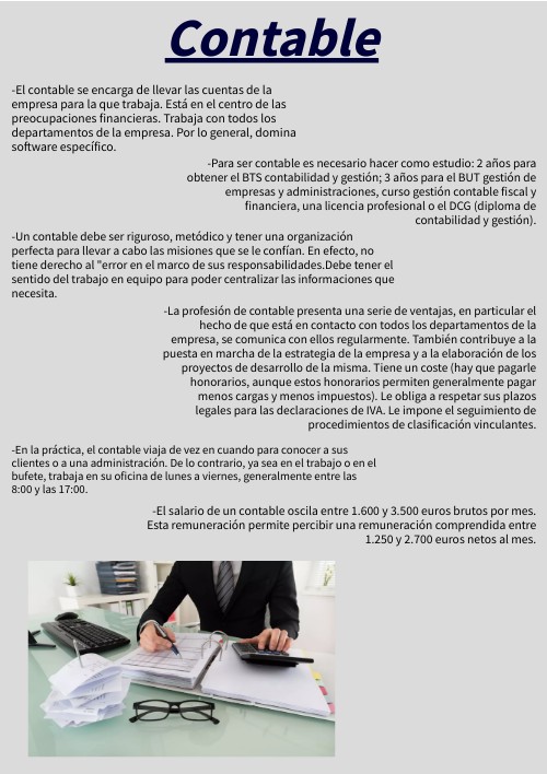 -El contable se encarga de llevar las cuentas de la empresa para la que trabaja. Está en el centro de las preocupaciones financieras. Trabaja con todos los departamentos de la empresa. Por lo general, domina software específico.