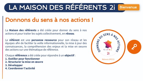 La Maison des référents a été créée pour donner du sens à nos actions et pour traiter les sujets collectivement, en réseau. Le référent est une personne ressource pour son réseau et les équipes afin de faciliter la veille informationnelle, la mise à jour des connaissances, la compréhension des enjeux et la mise en oeuvre des actions sur une thématique de référence.