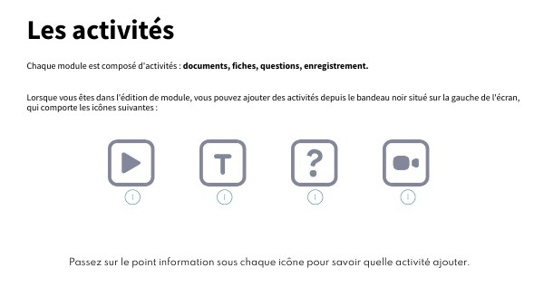 Chaque module est composé d'activités : documents, fiches, questions, enregistrement. Lorsque vous êtes dans l'édition de module, vous pouvez ajouter des activités depuis le bandeau noir situé sur la gauche de l'écran, qui comporte les icônes suivantes :