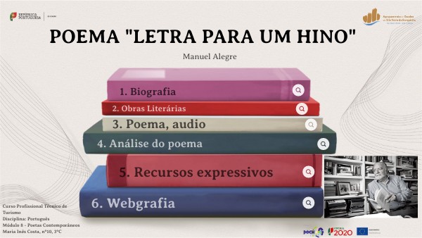 Este trabalho surge no âmbito da disciplina de Português. Neste trabalho irei apresentar um poema de Manuel Alegre - "Letra para um hino", onde analiso o poema, refiro algumas das suas principais obras literárias e faço uma breve biografia do escritor.