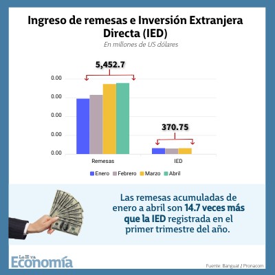 Las remesas acumuladas de enero a abril son 14.7 veces más que la IED registrada en el primer trimestre del año.