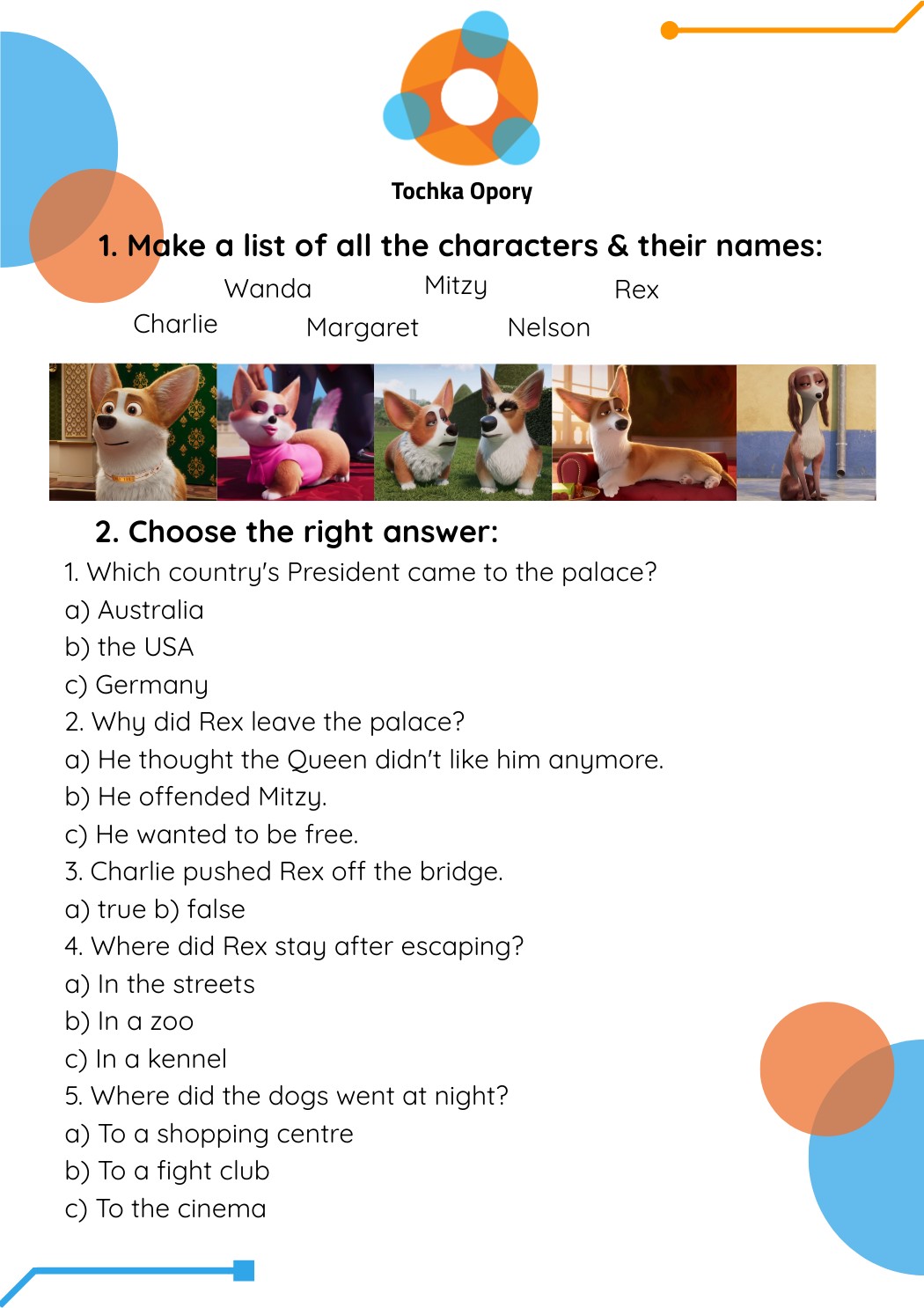 1. Which country's President came to the palace?a) Australia b) the USA c) Germany 2. Why did Rex leave the palace? a) He thought the Queen didn't like him anymore. b) He offended Mitzy. c) He wanted to be free. 3. Charlie pushed Rex off the bridge. a) true b) false 4. Where did Rex stay after escaping? a) In the streets b) In a zoo c) In a kennel 5. Where did the dogs went at night? a) To a shopping centre b) To a fight club c) To the cinema
