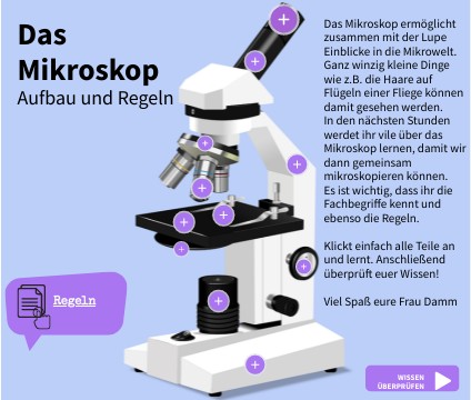 Das Mikroskop ermöglicht zusammen mit der Lupe Einblicke in die Mikrowelt.Ganz winzig kleine Dinge wie z.B. die Haare auf Flügeln einer Fliege können damit gesehen werden. In den nächsten Stunden werdet ihr vile über das Mikroskop lernen, damit wir dann gemeinsam mikroskopieren können. Es ist wichtig, dass ihr die Fachbegriffe kennt und ebenso die Regeln. Klickt einfach alle Teile an und lernt. Anschließend überprüft euer Wissen! Viel Spaß eure Frau Damm