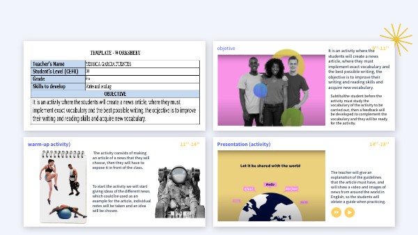 The activity will begin by defining the groups in which they will work and choose one of the ideas they have individually to work on, the students will be able to take the examples seen in the previous video, and the vocabulary of the activity and then they will have to create the written article and then expose it in front of everyone, we will establish turns for each group and the activity will begin, this activity is too proactive, didactic, and fun.