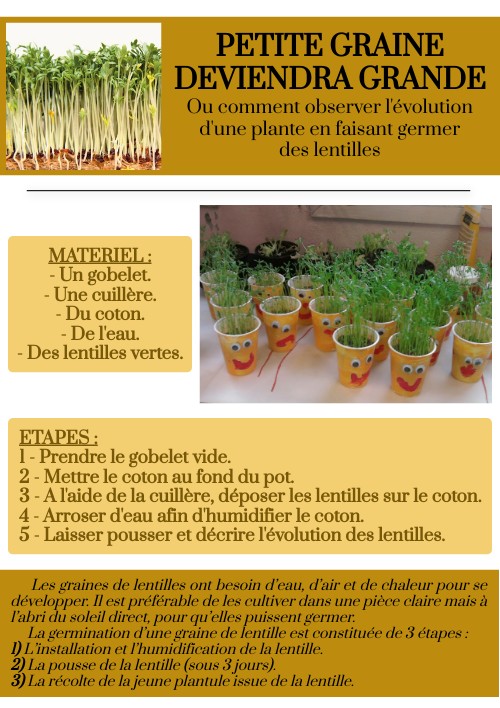 ETAPES : 1 - Prendre le gobelet vide. 2 - Mettre le coton au fond du pot. 3 - A l'aide de la cuillère, déposer les lentilles sur le coton. 4 - Arroser d'eau afin d'humidifier le coton. 5 - Laisser pousser et décrire l'évolution des lentilles.
