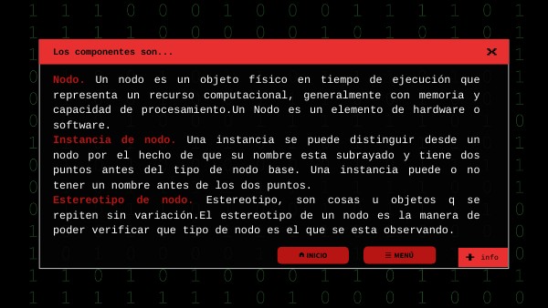 Nodo. Un nodo es un objeto físico en tiempo de ejecución que representa un recurso computacional, generalmente con memoria y capacidad de procesamiento.Un Nodo es un elemento de hardware o software.Instancia de nodo. Una instancia se puede distinguir desde un nodo por el hecho de que su nombre esta subrayado y tiene dos puntos antes del tipo de nodo base. Una instancia puede o no tener un nombre antes de los dos puntos. Estereotipo de nodo. Estereotipo, son cosas u objetos q se repiten sin variación.El estereotipo de un nodo es la manera de poder verificar que tipo de nodo es el que se esta observando.
