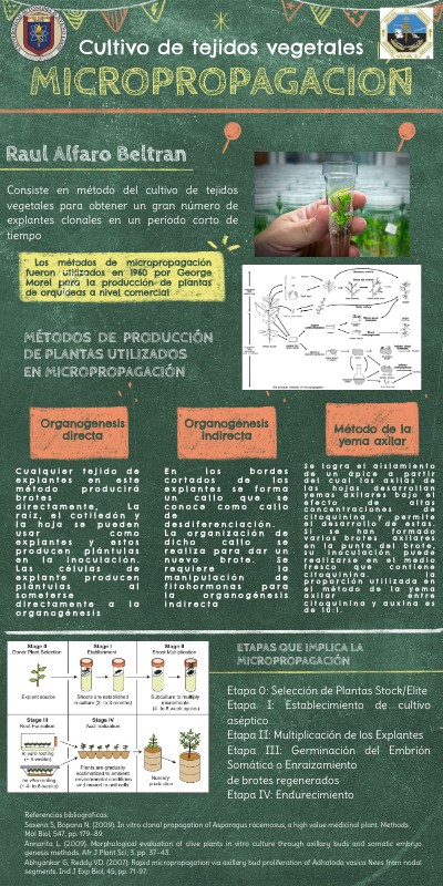 Referencias bibliograficas: Saxena S, Bopana N. (2009). In vitro clonal propagation of Asparagus racemosus, a high value medicinal plant. Methods Mol Biol, 547, pp. 179–89. Annarita L. (2009). Morphological evaluation of olive plants in vitro culture through axillary buds and somatic embryo genesis methods. Afr J Plant Sci; 3. pp. 37–43. Abhyankar G, Reddy VD. (2007). Rapid micropropagation via axillary bud proliferation of Adhatoda vasica Nees from nodal segments. Ind J Exp Biol, 45, pp. 71-97.