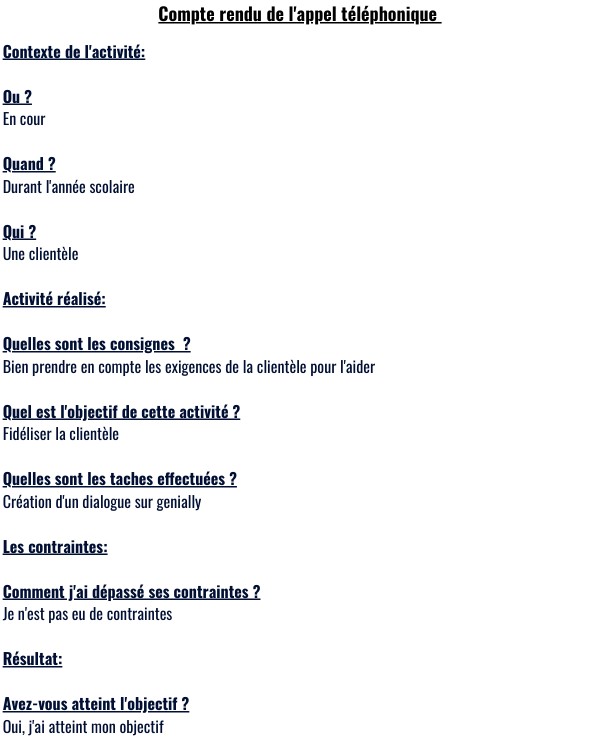 Contexte de l'activité: Ou ? En cour Quand ? Durant l'année scolaire Qui ? Une clientèle Activité réalisé: Quelles sont les consignes ? Bien prendre en compte les exigences de la clientèle pour l'aider Quel est l'objectif de cette activité ? Fidéliser la clientèle Quelles sont les taches effectuées ? Création d'un dialogue sur genially Les contraintes: Comment j'ai dépassé ses contraintes ? Je n'est pas eu de contraintes Résultat: Avez-vous atteint l'objectif ? Oui, j'ai atteint mon objectif