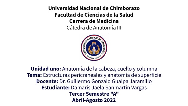 Unidad uno: Anatomía de la cabeza, cuello y columnaTema: Estructuras pericraneales y anatomía de superficieDocente: Dr. Guillermo Gonzalo Gualpa JaramilloEstudiante: Damaris Jaela Sanmartin Vargas Tercer Semestre "A" Abril-Agosto 2022