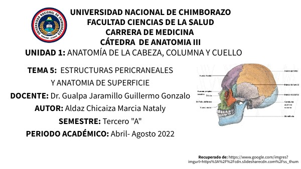 TEMA 5: ESTRUCTURAS PERICRANEALES Y ANATOMIA DE SUPERFICIE DOCENTE: Dr. Gualpa Jaramillo Guillermo Gonzalo AUTOR: Aldaz Chicaiza Marcia Nataly SEMESTRE: Tercero "A" PERIODO ACADÉMICO: Abril- Agosto 2022