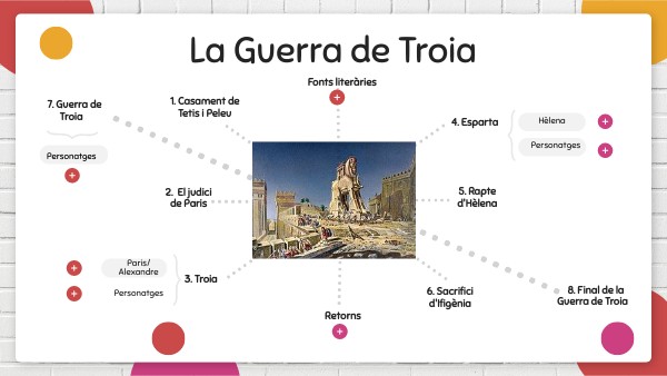 La guerra de Troia va durar 10 anys i s'enforntaven els grecs comandats per Agammèmnom - els troians comandats per Hèctor.Va ser un setge amb batalles continues a l'exterior de les muralles de la ciutat i en el pobles del voltant de Troia. Hi ha diferents episodis importants durant aquests 10 anys de guerra: L'episodi de Criseida i Briseida La mort de Patròcle La mort d'Hèctor La mort d'Aquil·les