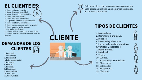 1. El que recibe un servicio. 2. Quien tiene una necesidad. 3. Quien tiene el poder de decidir. 4. El que define la calidad. 5. El que evalua tu desempeño. 6. El que establece los requerimientos. 7. El que justifica tu existencia. 8. El que tiene derecho a reclamar y exigir. 9. El que busca la mejor opción. 10. La mejor publicidad. 11. El que utiliza mis productos y servicios. 12. El que no siempre tiene la razón, pero va primero.