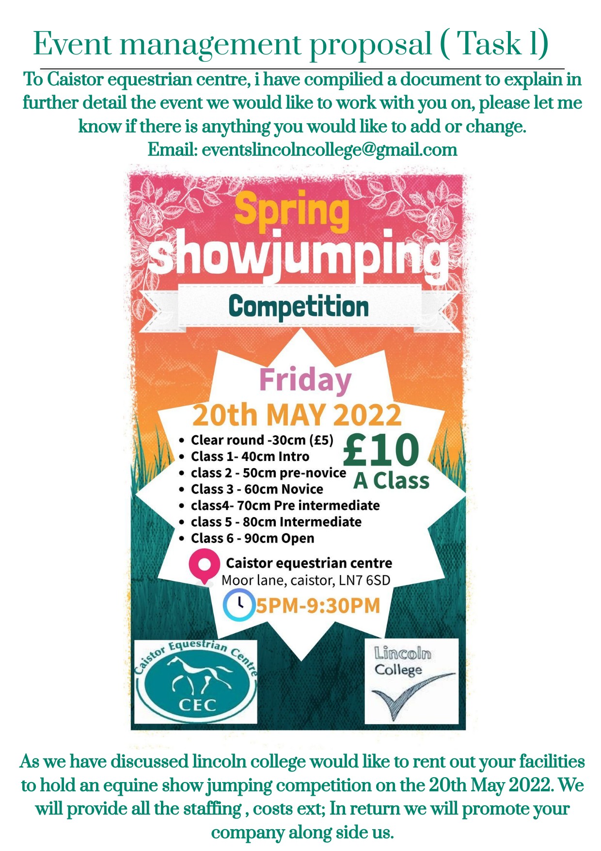 To Caistor equestrian centre, i have compilied a document to explain in further detail the event we would like to work with you on, please let me know if there is anything you would like to add or change.Email: eventslincolncollege@gmail.com As we have discussed lincoln college would like to rent out your facilities to hold an equine show jumping competition on the 20th May 2022. We will provide all the staffing , costs ext; In return we will promote your company along side us.