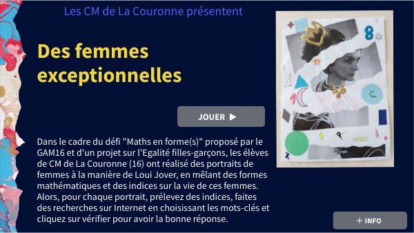 Vous allez découvrir des portraits de femmes exceptionnelles réalisés par les élèves de CM de l'école de La Couronne, en Charente. Ils devaient dans ce travail insérer des formes mathématiques et des indices sur la vie de ces personnages. Alors, prélevez les indices de ces créations, faites des recherches sur internet pour trouver l'identité de ces femmes. Si cela ne suffit pas, aidez-vous des indices complémentaires que les élèves ont proposés. Bon courage !