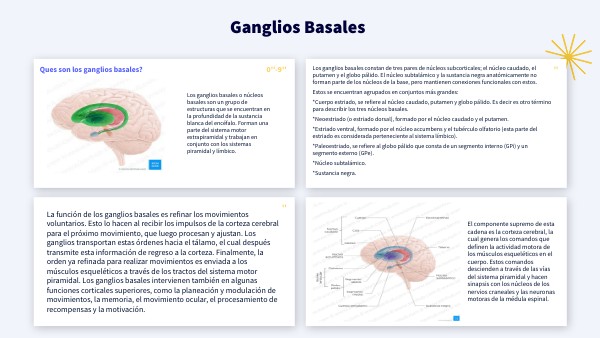 Los ganglios basales o núcleos basales son un grupo de estructuras que se encuentran en la profundidad de la sustancia blanca del encéfalo. Forman una parte del sistema motor extrapiramidal y trabajan en conjunto con los sistemas piramidal y límbico.