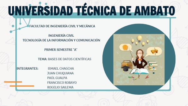 FACULTAD DE INGENIERÍA CIVIL Y MECÁNICA INGENIERÍA CIVIL TECNOLOGÍA DE LA INFORMACIÓN Y COMUNICACIÓN PRIMER SEMESTRE "A" TEMA: BASES DE DATOS CIENTÍFICAS INTEGRANTES: ISMAEL CHAGCHA JUAN CHUQUIANA PAÚL GUALPA FRANCISCO ROBAYO ROGELIO SAILEMA