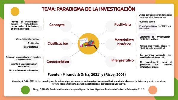 Miranda, & Ortíz. (2021). Los paradigmas de la investigación: un acercamiento teórico para reflexionar desde el campo de la investigación educativa. Revista Iberoamericana para la Investigación y el Desarrollo Educativo. Ricoy, C. (2006). Contribución sobre los paradigmas de investigación. Revista do Centro de Educação, 11-22.