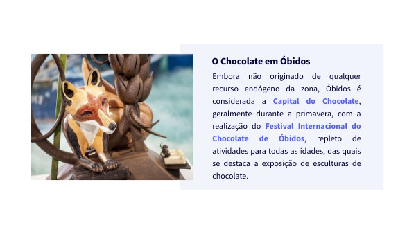 Embora não originado de qualquer recurso endógeno da zona, Óbidos é considerada a Capital do Chocolate, geralmente durante a primavera, com a realização do Festival Internacional do Chocolate de Óbidos, repleto de atividades para todas as idades, das quais se destaca a exposição de esculturas de chocolate.