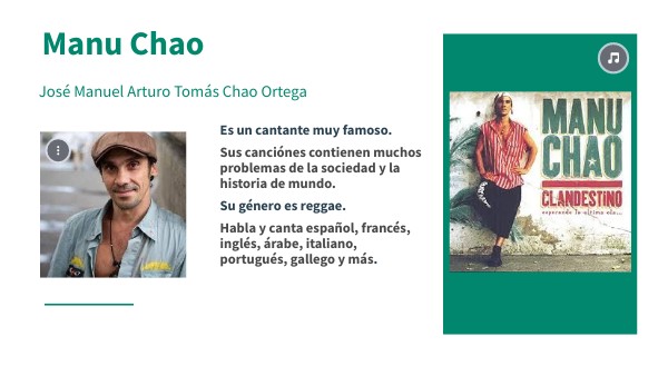 Es un cantante muy famoso. Tiene 60 años. Sus canciones contienen muchos problemas de la sociedad y la historia de mundo. Es famoso por su combinación de músicas. Rock, rumba, hip-hop, salsa, raÏ y punk. Habla y canta español, francés, inglés, árabe, italiano, portugués, gallego y más.