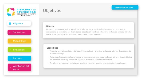 Para el propósito de este curso se propone opciones diferentes para demostrar lo aprendido, lo cual se constituye en un referente al momento de estructurar los tres módulos relacionados con: Los derechos humanos en la educación con énfasis en la inclusión educativa, Diseño Universal para el Aprendizaje para atender la diversidad y Disciplina positiva dentro y fuera del aula. Los módulos desarrollan contenidos, así como actividades con un sistema iconográfico que las identifican