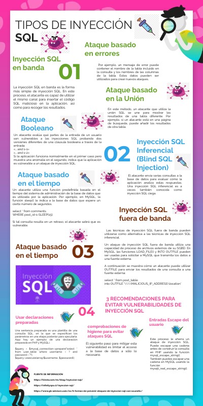 FUENTE DE INFORMACIÓN https://kinsta.com/es/blog/inyeccion-sql/ https://infinityspa.cl/inyeccion-sql/ https://www.gb-advisors.com/es/6-formas-de-prevenir-ataques-de-inyeccion-sql-con-acunetix/