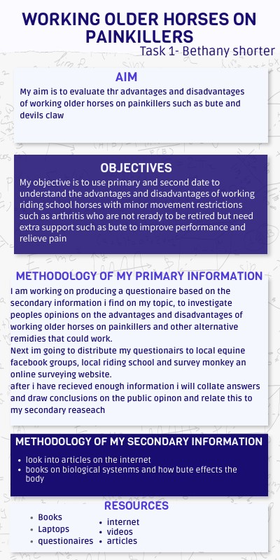 I am working on producing a questionaire based on the secondary information i find on my topic, to investigate peoples opinions on the advantages and disadvantages of working older horses on painkillers and other alternative remidies that could work.Next im going to distribute my questionairs to local equine facebook groups, local riding school and survey monkey an online surveying website. after i have recieved enough information i will collate answers and draw conclusions on the public opinon and relate this to my secondary reaseach