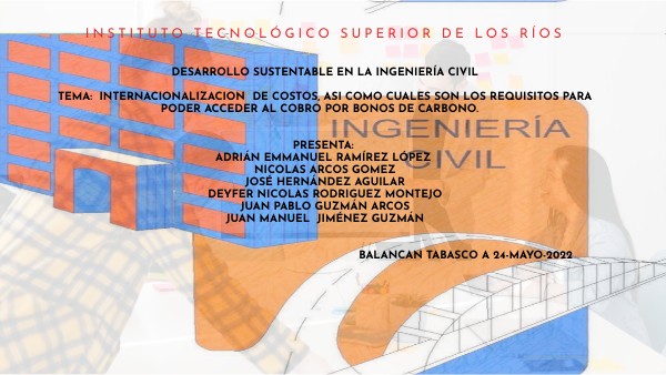 Desarrollo Sustentable en la Ingeniería Civil Tema: internacionalizacion de costos, asi como cuales son los requisitos para poder acceder al cobro por bonos de carbono. Presenta: Adrián Emmanuel Ramírez López Nicolas Arcos Gomez José Hernández Aguilar Deyfer Nicolas Rodriguez Montejo Juan Pablo Guzmán Arcos Juan Manuel Jiménez Guzmán Balancan Tabasco a 24-mayo-2022