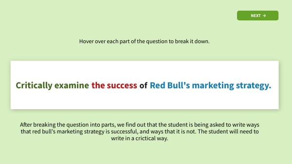 After breaking the question into parts, we find out that the student is being asked to write ways that red bull’s marketing strategy is successful, and ways that it is not. The student will need to write in a crictical way.