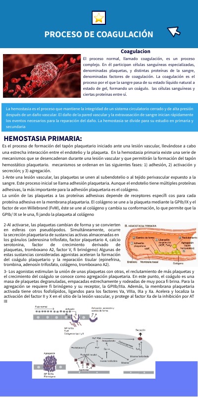 Es el proceso de formación del tapón plaquetario iniciado ante una lesión vascular, llevándose a cabo una estrecha interacción entre el endotelio y la plaqueta. En la hemostasia primaria existe una serie de mecanismos que se desencadenan durante una lesión vascular y que permitirán la formación del tapón hemostático plaquetario. mecanismos se ordenan en las siguientes fases: 1) adhesión, 2) activación y secreción; y 3) agregación. 1-Ante una lesión vascular, las plaquetas se unen al subendotelio o al tejido perivascular expuesto a la sangre. Este proceso inicial se llama adhesión plaquetaria. Aunque el endotelio tiene múltiples proteínas adhesivas, la más importante para la adhesión plaquetaria es el colágeno. La unión de las plaquetas a las proteínas adhesivas depende de receptores específi cos para cada proteína adhesiva en la membrana plaquetaria. El colágeno se une a la plaqueta mediante la GPIb/IX y el factor de von Willebrand (FvW), éste se une al colágeno y cambia su conformación, lo que permite que la GPIb/ IX se le una, fi jando la plaqueta al colágeno