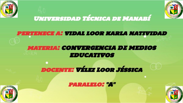 Universidad Técnica de Manabí pertenece a: vidal loor karla natividad materia: CONVERGENCIA DE MEDIOS EDUCATIVOS docente: Vélez Loor Jéssica paralelo: "A"
