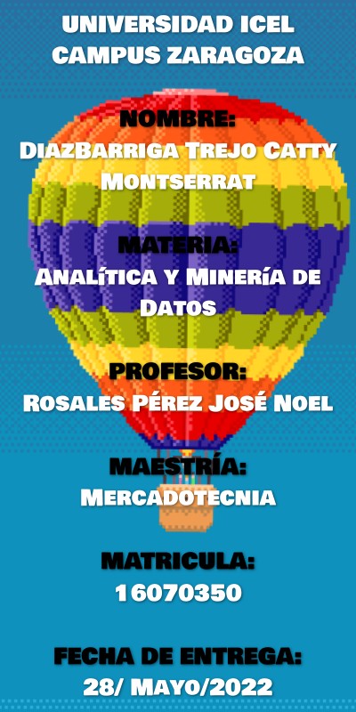UNIVERSIDAD ICEL CAMPUS ZARAGOZA NOMBRE: DiazBarriga Trejo Catty Montserrat MATERIA: Analítica y Minería de Datos PROFESOR: Rosales Pérez José Noel MAESTRÍA: Mercadotecnia MATRICULA: 16070350 FECHA DE ENTREGA: 28/ Mayo/2022