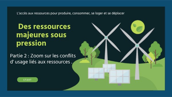 Modalités : - Individuellement ou en binôme , les élèves font une recherche sur un conflit d' usage lié à une ressource - ils organisent leur travail sous forme de schéma ou de carte mentale Consignes: - Identifiez la ressource menacée (ou conflictuelle)- Parcourez les documents (vidéos, texte, sites...) pour vous renseigner - Observez les acteurs : quels sont leurs intérêts, leurs actions ?- Présentez l'analyse du conflit d'usage (ressource conflictuelle, jeu d'acteurs) Rappel : un conflit d'usage désigne une situation dans laquelles des acteurs sont en désaccord concernant l'appropriation, la gestion ou l'exploitation d'une ressource.