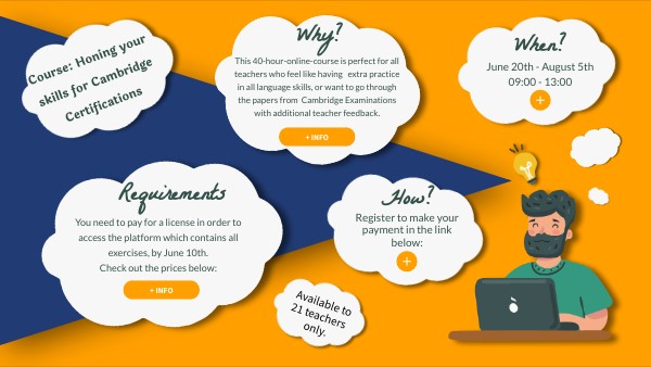 This 40-hour-online-course is perfect for all teachers who feel like having extra practice in all language skills, or want to go through the papers from Cambridge Examinations with additional teacher feedback.