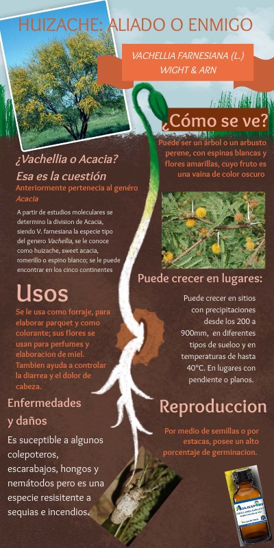 A partir de estudios moleculares se determino la division de Acacia, siendo V. farnesiana la especie tipo del genero Vachellia, se le conoce como huizache, sweet acacia, romerillo o espino blanco; se le puede encontrar en los cinco continentes