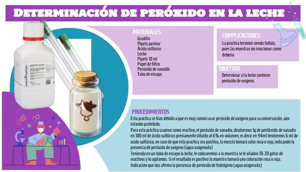 Esta práctica se hizo debido a que es muy común usar peróxido de oxígeno para su conservación, aún estando prohibido.Para esta práctica usamos como reactivo, el peróxido de vanadio, disolvemos 1g de pentóxido de vanadio en 100 ml de ácido sulfúrico previamente diluido al 6% en volumen, es decir en 94ml tendremos 6 ml de acido sulfúrico, en caso de que esta practica sea positiva, la mezcla tomará color rosa o rojo, indicando la presencia de peróxido de oxígeno (agua oxigenada) Teniendo en un tubo de ensayo la leche, le colocaremos a la muestra se le añaden 10-20 gotas de reactivos y lo agitamos. Si el resultado es positivo la muestra tomará una coloración rosa o roja. Indicación que nos afirma la presencia de peróxido de hidrógeno (agua oxigenada)