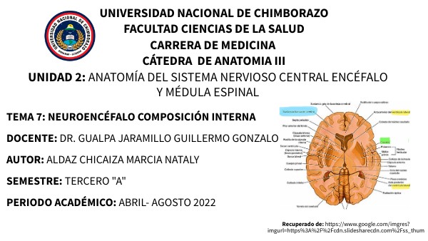 TEMA 7: Neuroencéfalo composición interna DOCENTE: Dr. Gualpa Jaramillo Guillermo Gonzalo AUTOR: Aldaz Chicaiza Marcia Nataly SEMESTRE: Tercero "A" PERIODO ACADÉMICO: Abril- Agosto 2022
