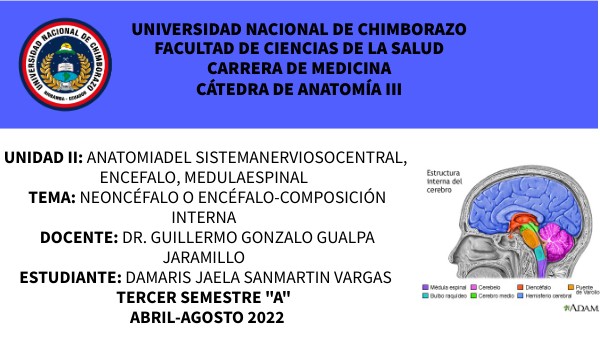 UNIDAD II: ANATOMIADEL SISTEMANERVIOSOCENTRAL, ENCEFALO, MEDULAESPINAL TEMA: NEONCÉFALO O ENCÉFALO-COMPOSICIÓN INTERNA DOCENTE: DR. GUILLERMO GONZALO GUALPA JARAMILLO ESTUDIANTE: DAMARIS JAELA SANMARTIN VARGAS TERCER SEMESTRE "A" ABRIL-AGOSTO 2022
