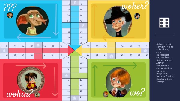 Gebrauche bei der Antwort eine Präposition, dem Fragebereich entsprechend. Bei der falschen Antwort bekommst du eine zusätzliche Frage von Mitspielern.Wer schafft seine Runde als Erster (Erste)?