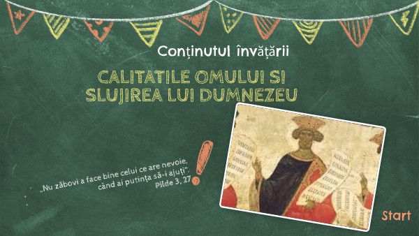 Calitățile omului şi slujirea lui Dumnezeu (rolul calităților personale în viața omului; exemple biblice de valorizare a calităților personale – construirea templului din Ierusalim/psalmii lui David/pildele lui Solomon)