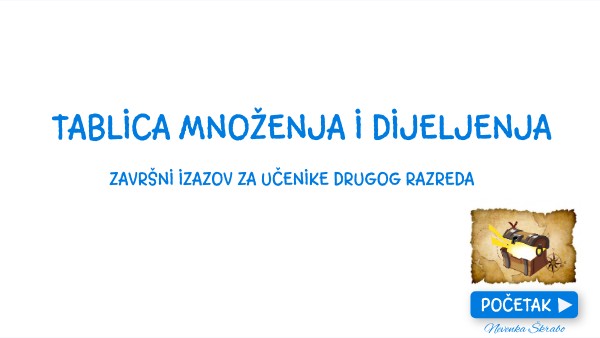 Tablica množenja i dijeljenja je usvojena! slijede ljetni praznici. uživaj, istražuj, igraj se, druži s priljateljima. Pronađite skrivene otoke i blaga na njima. no, kako bi spremno i uspješno startao/startala u treći razred nemoj zaboraviti prije početka nastave ponoviti gradivo.vidimo se!!