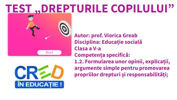 Testul „DREPTURILE COPILULUI” este o resursă educațională deschisă, realizată în cadrul Proiectului CRED. Testul are încorporat videoclipul „Drepturile mele” și conține 10 itemi de alegere multiplă. Mult succes tuturor!
